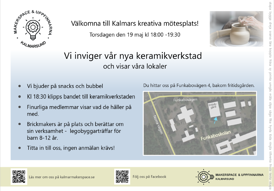 I och med att vårterminen börjar så skulle vi också vilja fortsätta med lite workshops på våra maskiner och tekniker. Vi har även lite introduktionsträffar i träverkstaden samt keramiken planerade. Ni får självklart information om detta också, då det börjar bli dags. Maila gärna asa@kalmarmakerspace.se om ni har frågor/funderingar gällande dessa typer av aktiviteter. Åsa är vårt fantastiska workshop-lim. Hon håller ihop detta som ni säkert har förstått!